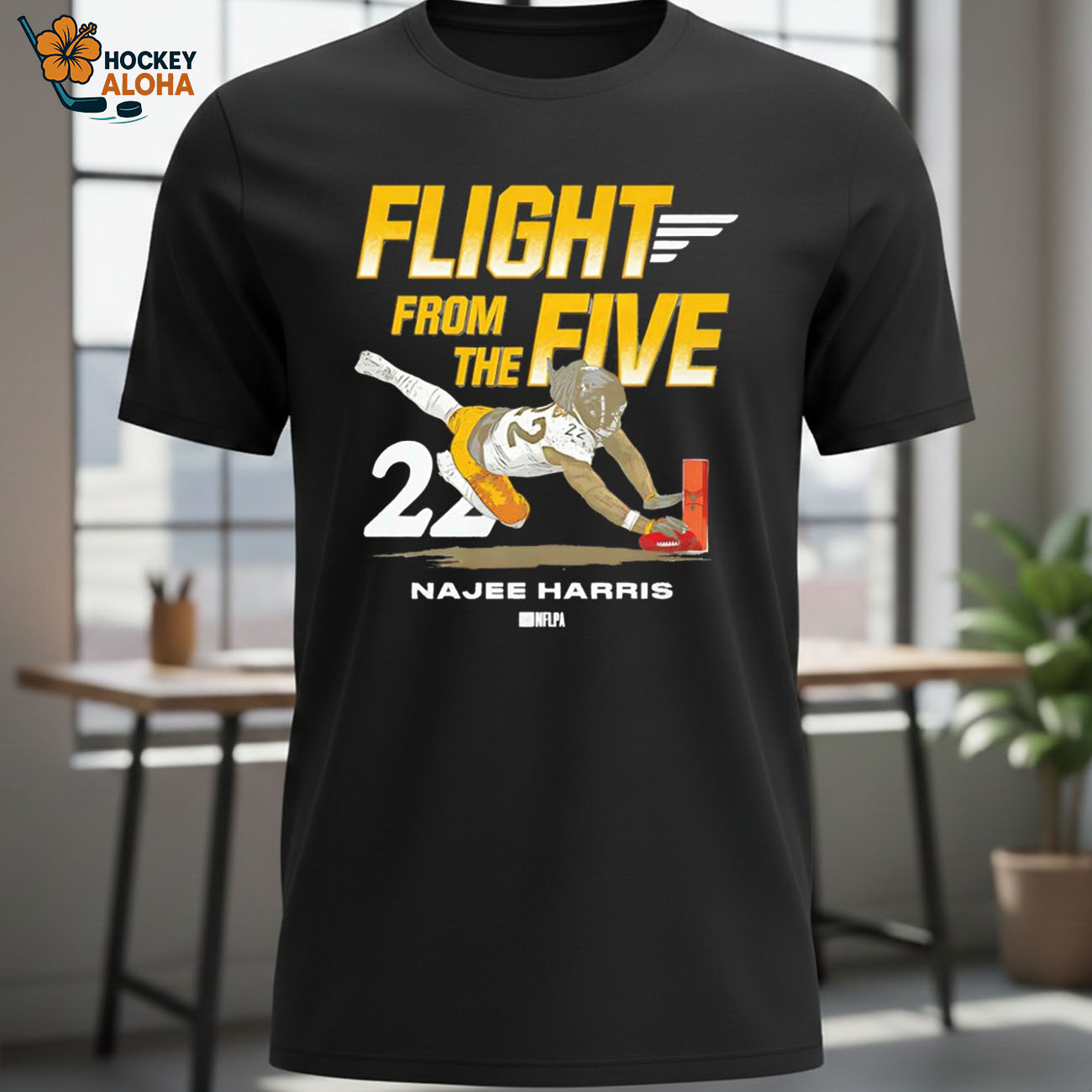 The highlight of the Najee Harris Flight From The Five Pittsburgh Steelers Shirt lies in its clean, high-definition design. Printed with sharp detail and vibrant color, the artwork stands out while remaining easy to wear and style. It’s the kind of piece that naturally draws attention and earns compliments without being over the top.