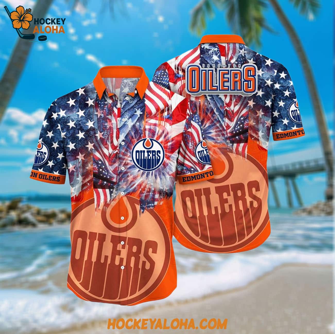 Nhl Edmonton Oilers Hawaiian Shirt With American Independence Day Pattern Summer Hawaiian Shirt – the ultimate Hawaiian shirt for every true NHL fan! Whether you’re a die-hard supporter of your favorite NHL team or just a passionate enthusiast of the game, this shirt brings the perfect blend of team spirit and island vibes in a vibrant, tropical design. Specifically crafted for fans of NHL teams, this piece is not just another shirt – it’s a statement, a bold declaration of your love for the game, and a tribute to the beauty of the Hawaiian spirit.