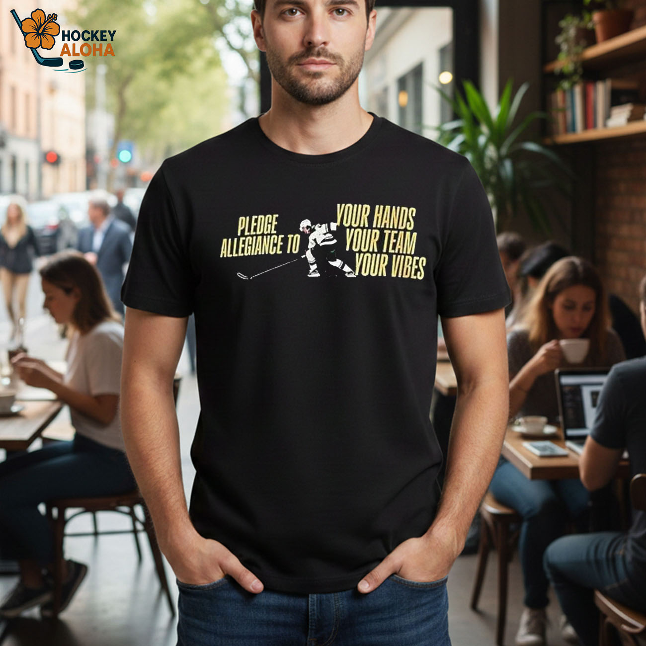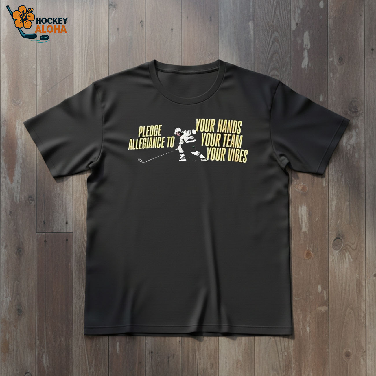 Whether you’re rocking it with jeans, shorts, or joggers, the Quinn Hughes Minnesota Wild Hockey Pledge Allegiance To Your Hands Your Team Your Vibes Shirt fits seamlessly into any fan’s wardrobe. Made for those who breathe hockey and live with passion, this is a must-have for anyone who wants to bring the tropics to the rink.
